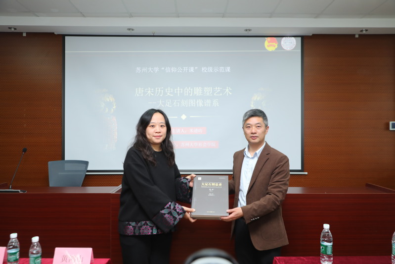 3月28日,“唐宋历史中的雕塑艺术——大足石刻图像谱系”校级素养公开课开讲。院长黄鸿山主持议程。大足石刻研究院副院长龙伟和天博体育 党委副书记、副院长朱今进行了赠书仪式,龙伟副院长向天博体育 赠送了《大足石刻内容总录》。