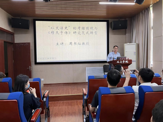 周教授从陈寅恪先生《〈桃花源记〉旁证》及引发的学术争议谈起,接着以《穆天子传》东巡交通地理为例,指出《穆天子传》东巡卷中的一部分地名均有确切所指;另有一部分地名虽有相对集中的流传区域,但并无确切地点;还有一部分地名与古代文献所记同名地名,张冠李戴,错杂混淆,和《穆天子传》东巡中的方位相悖,无法和古代文献中的地名对号入座。还有一些地名、族名,则于古代文献和金文等资料无征,并不具有历史地理价值。《穆天子传》东巡地理交通的写实与虚构两重风格呈现,则足以为《穆天子传》以小说神话为主,兼具多学科价值的体裁性质提供具有重要说服力的侧证。周教授强调指出,忽略《穆天子传》的小说、神话体裁性质,混淆文学作品中寓意与纪实的区分,滥用文史互证法,不仅不能做到文史结合,而且会给古史研究造成一系列混乱。在新的学术背景下,多学科视野下的《穆天子传》研究,应正视《穆天子传》以小说、神话为主,兼具多学科价值的文学类文献的体裁性质,准确把握《穆天子传》的产生背景、著述动机和意图;尊重现代学科的独立性,推进《穆天子传》研究在学术分工的基础上向着专业化方向发展;重视综合与比较研究,拓展与深化《穆天子传》研究的新旧领域;推进《穆天子传》研究范式从传统考据学向文化阐释学与跨文化研究转变。周教授的报告,内容丰富,思想深刻,语言生动,逻辑周严,彰显出扎实的学术功底、宽广的学术视野和卓越的史料理论修养。报告在师生热烈的掌声中结束。