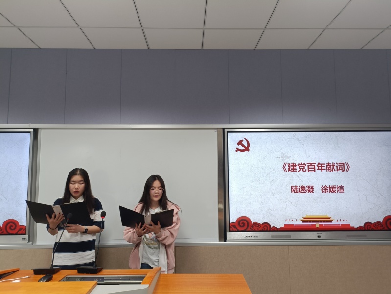 陆逸凝、徐媛煊同学合诵《建党百年献词》,两位同学以声情并茂的朗诵,将党的百年峥嵘岁月如一幅厚厚的画卷一般徐徐展开。