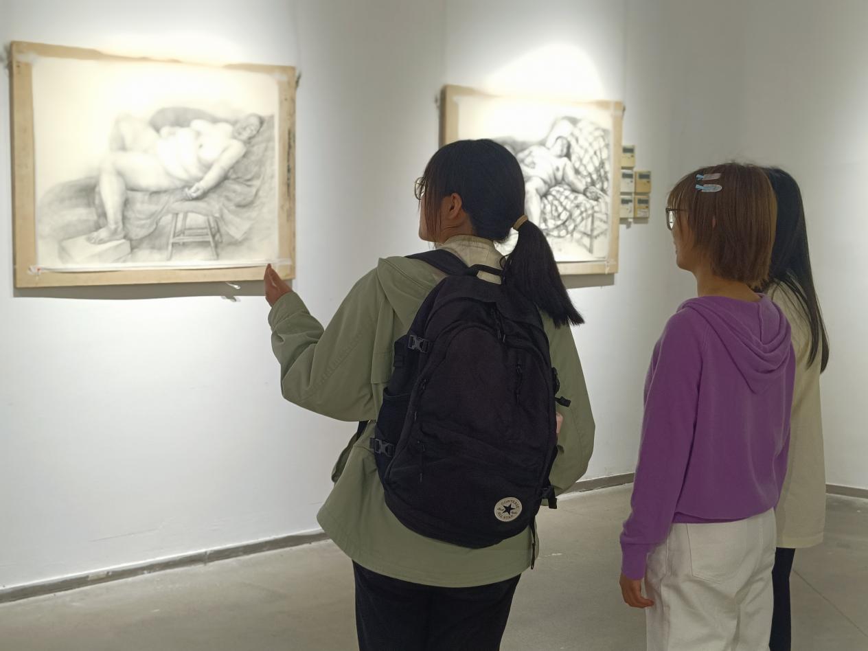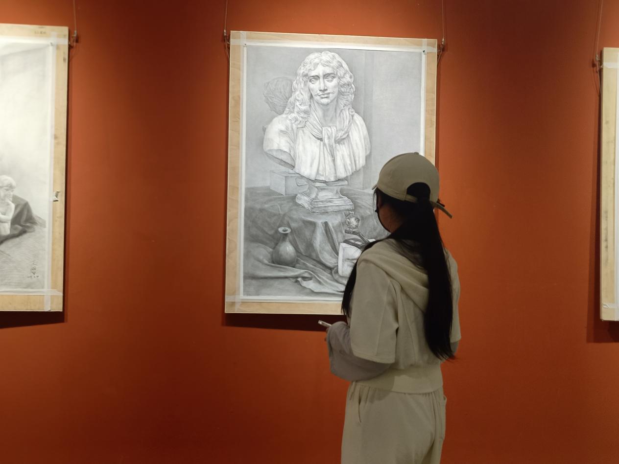 活动现场,张意泊老师热情洋溢地向同学们介绍,这是他在400张作品中精选出的151张作品,并亲自将其一一陈列。同学们一进入展厅,就仿佛踏入了艺术的殿堂,被一幅幅精美的素描作品深深吸引,或驻足凝视,或小声交流探讨着画面的构图、线条以及表现手法等。