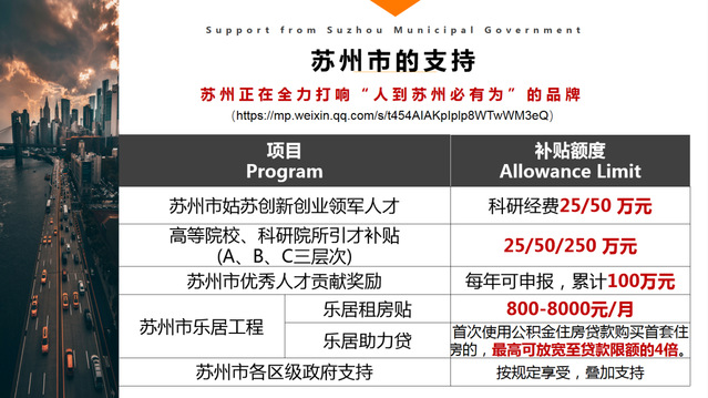 4.对入选国家引进类高层次人才计划者(含青年项目),符合条件可申请苏州工业园区“金鸡湖人才计划”,享受配套生活补贴和购房补贴支持,最高资助金额可达350万元!
