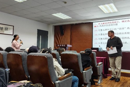 随后,方文教授围绕“论文选题与布局”展开指导。他指出,论文选题要具有科学、创新、实用等特性,可结合自身条件兴趣与国家社会需要,选择能充分发挥自身知识水平的研究课题,并通过广泛阅读、与导师同学讨论、参加学术会议等方式,不断调整和完善选题思路,最终确定一个既符合学术要求、又能激发个人潜能的研究方向,并运用马克思主义学科思维进行精心创作。