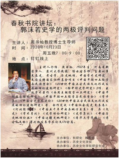 2020年10月23日晚7:00,西华师范大学历史文化天博体育 春秋书院讲坛在热烈的氛围中拉开序幕。应西华师范大学科研处、教务处邀请,天博体育 博士生导师周书灿教授以《郭沫若史学的两极评判问题》为题,为西华师范大学400多位师生作了一场精彩的学术报告。报告由西华师范大学历史文化天博体育 副院长金生杨教授主持。金生杨教授指出,周教授的讲座内容丰富,为我们解析了极为复杂的郭沫史学的评价问题,揭示了20世纪30年代以来,尤其是改革开放以来的有关郭沫史学的讨论、研究与评判问题,让复杂的历史清晰化,条理化,收获颇多。郭沫若史学在中国史学中地位极其重要,方法理论都具有重要借鉴甚至是指导意义,周教授无疑为我们开启了一扇门,指引了我们前进。舒大刚老师当年指导我们这些学生时,就特别强调了学习了解郭沫若史学,推荐我们去看林甘泉写作的书。周教授的讲座可以弥补我们的缺失。郭沫若是四川人,他的故居建有纪念馆,乐山师范天博体育 有四川省社科基地郭沫若研究中心,办有郭沫若研究期刊。周教授研究郭沫若,也是对四川学术的重视和贡献,欢迎周教授在适当的时候莅临天博体育,能够线下面对面地交流。