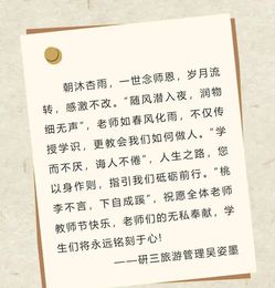 天博体育 团委以“一朝沐杏雨,一世念师恩”为主题,举办了教师节作品征集活动。活动吸引了广大学生积极参与,他们用文字承载情谊、用镜头捕捉感动、用声音传递祝福,以不同的形式赞美恩师春风化雨的深深教诲,这些作品彰显了天博体育 教师乐教爱生、甘于奉献的优良师德师风,营造了尊师重教的浓厚氛围。