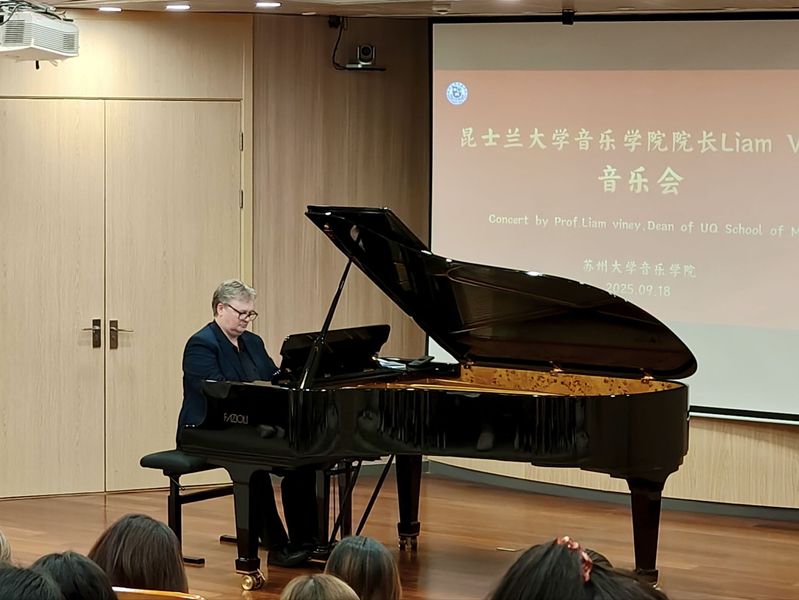 音乐会以中式经典曲目《阳关三叠》拉开帷幕,Liam Viney教授指尖落于琴键,将曲目里春日的灵动意境与细腻情感精准传递,琴音时而轻快婉转、时而舒缓悠扬,瞬间将现场师生带入沉浸式的音乐世界。随后,教授接连演奏多首中澳经典钢琴作品,既有中式旋律的典雅韵味,也有西式乐曲的热情张力,不同风格的音乐在现场碰撞出独特火花。现场志愿者专注聆听,不时以掌声回应精彩演奏。他们表示,这场音乐会不仅是一场听觉盛宴,更让大家在中外音乐的对话中,加深了对艺术多样性的理解。