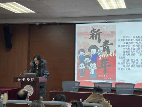 活动第二项议程为本期培训班特色活动书画比赛优秀作品展示及党建书屋阅读心得分享环节。首先由王思蕾、韦小米和李一桐三位在书画比赛中获奖的同学带来作品展示,她们围绕作品创作背景、创作理念和创作感悟进行解读,生动展现出作品背后新时代青年奋发向上的精神风貌。
