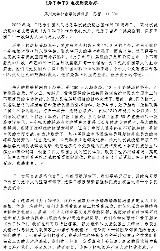 党委积极组织全院师生观看大型纪录片《为了和平》。通过在教研室、党支部等范围内开展交流体会,教师同学们纷纷发表了观看纪录片后的感想,充分展示了天博体育