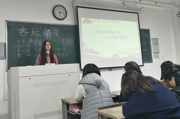 时值“双一流”建设正于各高校如火如荼的推进,天博体育 本科生历史学系党支部联合2015级历史学(师范)团支部和天博体育 杏坛社,结合师范专业特色,于11月30日晚在文综楼1002-2201开展了以“杏林新星掏心窝 三尺讲台话育人”为主题的“双一流 争当先锋”专题活动。本科生历史学系党支部全体党员、15级历史学(师范)全体团员、16级入党积极分子及17级学生代表参与了本次活动。天博体育 党委副书记兼党支部书记董娜参加本次活动。
