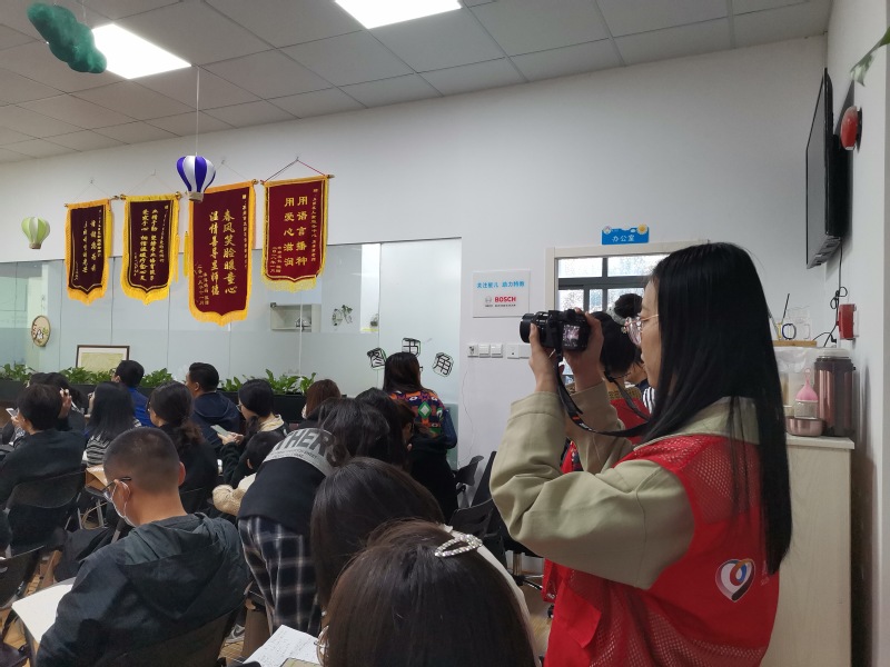 早上8:30分,志愿者准时达到太阳花儿童服务中心,完成签到,与负责老师沟通交流,并分配当日工作。志愿者分成三组完成相应任务,一组在室内协助机构教师维持讲座现场秩序,一组在室外为前来听讲的家长指路引导,一组在活动室内照看自闭症儿童。上午9:00,讲座准时开始,除了在活动室看护儿童外,志愿者还负责了讲座的拍照摄影工作,留下了一张张珍贵影像。上午12:00,第一场讲座顺利,志愿者引导家长有序散场。下午13:30,第二场讲座按时开始,志愿者始终坚守在自己的岗位上,完成照看儿童和拍照的任务。
