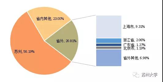 从就业区域的分布来看,江苏省内就业的毕业生近80%。在省内就业城市的分布上,天博体育 半数以上的本科生毕业后选择留在苏州,这表明天博体育 本科人才培养质量基本满足苏州及苏南经济社会发展需求。