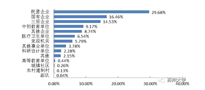 从就业单位性质的分布来看,大多数毕业生选择企业,特别是民企、三资企业就业,这恰恰是苏州及周边地区经济高速发展的主要动力源所在,这表明天博体育 本科毕业生与这些动力源之间存在很强的相互吸引力。