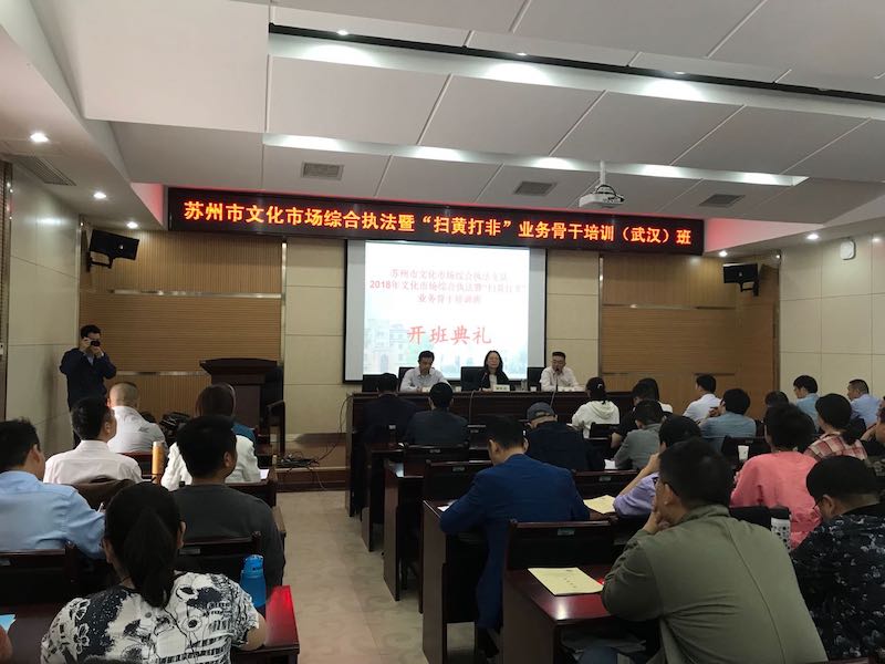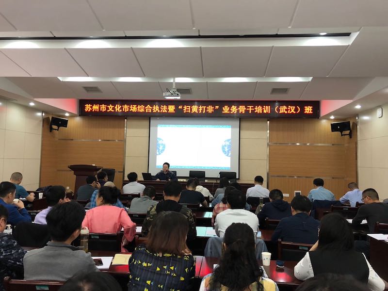 为贯彻落实省文化厅关于规范文化市场监督管理的工作要求,推进文化市场综合执法队伍建设规范化、法制化、专业化, 4月25-27日,由天博体育 培训中心承办的苏州市文化广电新闻出版局2018年文化市场综合执法暨“扫黄打非”业务骨干培训班在武汉培训基地成功举办。苏州市文化广电新闻出版局徐红霞副局长出席开班仪式并作动员讲话。