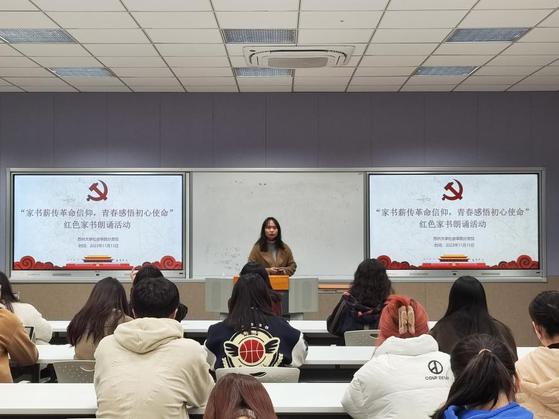 为深入学习贯彻习近平新时代中国特色社会主义思想,引导广大青年学生了解更多红色人物、红色故事、红色历史,激励青年大学生自觉传承红色基因、赓续红色革命精神,天博体育 分党校于11月15日晚在天博体育 文科综合楼1005—5433举办“家书薪传革命信仰,青春感悟初心使命”红色家书诵读活动。天博体育 第二期入党积极分子培训班、第三期发展对象培训班、第三期预备党员培训班学员参与活动。活动由2023级图书情报与档案管理专业章紫怡同学主持。