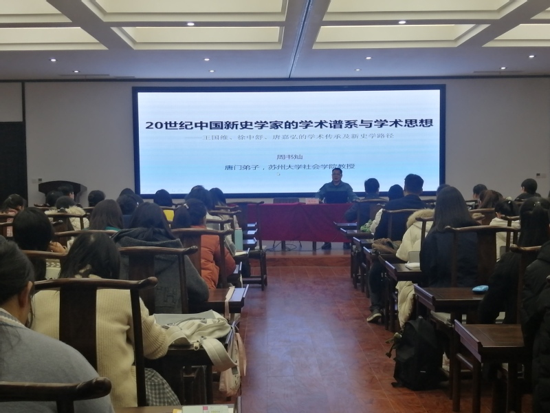 应商丘师范天博体育 人文天博体育 邀请,11月26日,天博体育 博士生导师、东吴学者周书灿教授,在梁园校区汉梁楼应天国学堂作了题为“20世纪中国新史学家的学术谱系与学术思想”的讲座。副校长郭文佳、人文天博体育 院长李可亭、副院长朱凤祥,历史系师生百余人参加讲座。