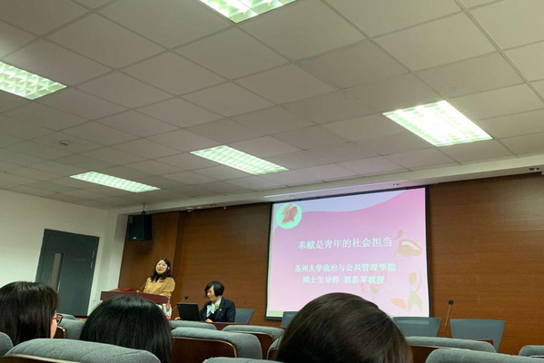 郭教授在讲奉献和担当的概念前,没有用晦涩难懂的文字去描述,而是以1989年春晚上的一首歌曲《爱的奉献》引出话题,引起了大家的强烈兴趣。展示歌词的时候,郭教授情不自禁地哼唱了几句,悠扬的歌声唤起了同学们的美好记忆,赢得了在座同学的热烈鼓掌。随后,郭教授用字典里的解释向大家阐述了奉献和担当的含义,又结合习近平主席对于青年人期望的“勤学,修德,明辨,笃实”的八字要求,对青年人的担当和奉献进行了说明。她讲到,身为党的积极分子,要在思想和行动上具有高度,要勇于舍弃自己的个人利益,而去成就他人的利益,服务他人。