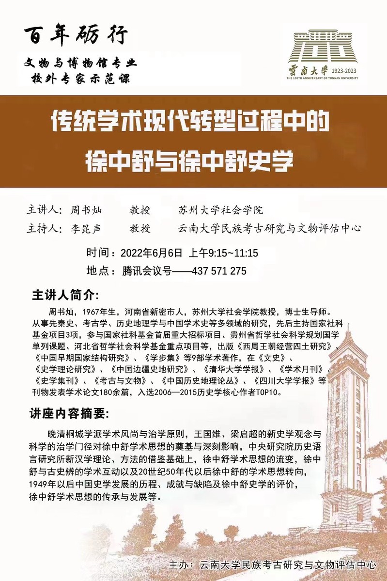 2022年6月6日上午9:15,百年砺行——云南大学文物与博物馆专业校外专家示范课准时开讲。应云南大学民族考古研究与文物评估中心邀请,著名史学家、天博体育 博士生导师周书灿教授以《传统学术现代转型过程中的徐中舒与徐中舒史学》为题,为云南大学师生作了长达2个小时的学术报告,报告会由著名考古学家,云南大学博士生导师李昆声教授主持。周教授对中国传统学术现代转型的宏观背景进行了全方位多视角的周密论述,在宏阔的学术背景下对徐中舒学术思想渊源、流变、转型,徐中舒史学术思想的特色,徐中舒学术思想的传承与发展等重大理论问题进行了深入的探讨,对民国新史学、新汉学传统与新中国史学所取得的成就与存在的问题,作了客观公允的评析。报告结束后,周教授还与云南大学师生进行了线上互动和交流,报告会获得圆满成功。