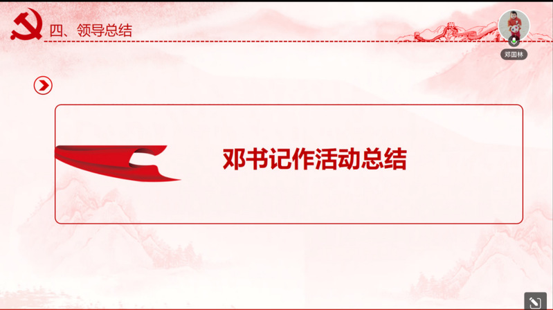 最后,邓国林书记作总结发言。邓书记对毕业生党员提出三点希望,一是希望党员同学要时刻以优秀党员的标准严格要求自己,踏实进取,勇于担当;二是希望各位党员走上工作岗位以后要处理好“公”和“私”的关系,做到大公无私,公而忘私,先公后私,决不能公私不分,假公济私,损公肥私;三是希望毕业班各位党员在今年疫情的特殊毕业季,要努力站好最后一班岗,为身边的同学提供帮助。同时邓书记也由衷地祝福全体毕业生前程似锦,不负韶华。