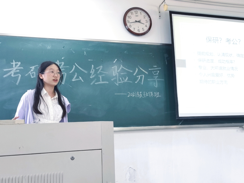毕煊焓同学,考公成功上岸到昆山税务局。她首先向大家讲解了如何进行选保研考公或考研的选择,她从保研进度,成功概率专业、大环境就业情况,个人兴趣爱好、优势期待的职业方向等几个方面来综合考虑决定自己所要前进的方向。而在学习方面,她分享了行测和申论两方面的备考成功经验,展现出了极高的自律性和扎实的专业知识。她表示准备行测要从三个阶段入手:打牢基础—模块提升—套题练习,还分享了获取相关知识的渠道及网课推荐。另外毕煊焓同学还强调了心态的问题,她建议道:越早开始越好,大三最好修完所有学分,留充足的时间给大四准备;同学们不要被报录比吓到,你就是天选之子;心态要平稳,复盘要及时;争取获得家人的支持(心理+金钱);选岗位很重要,对自己有清醒的认识。要高效率!不要假装很努力!以及一定要坚持到最后。