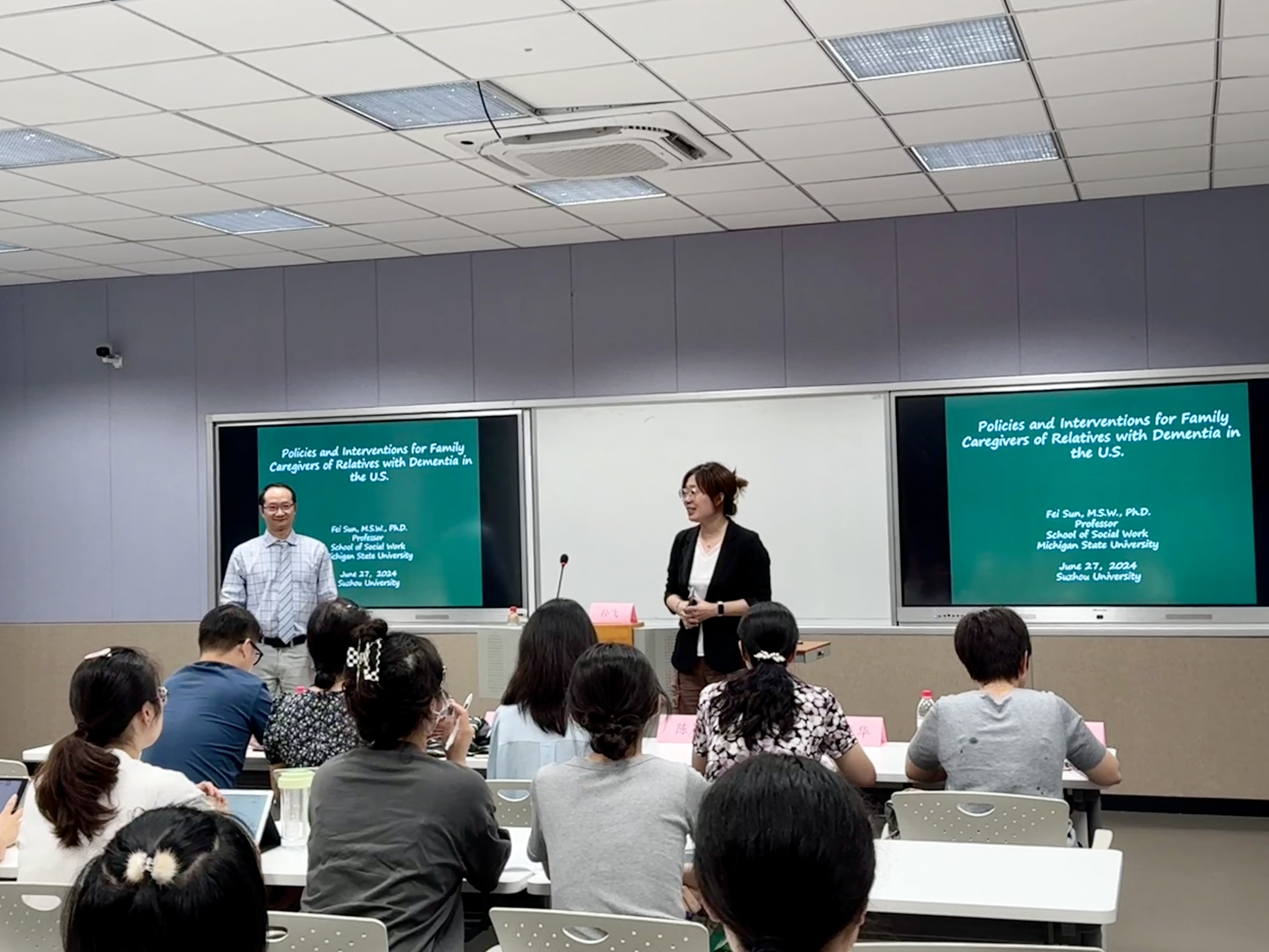 为了进一步加强天博体育 社会工作专业师生的学术交流,提升学生的实践素养,社会学与社会工作系于6月27日晚上在文综楼5433室举办“东吴社会学”系列学术讲座。讲座由天博体育 副教授、社会学及社会工作系副主任刘素素主持,特别邀请到了美国密歇根州立大学孙飞教授带来一场主题为《认知症家庭照料的支持政策和干预实践:美国的经验》的学术讲座。劳动与社会保障系陈红霞老师、李曼老师、刘欢老师,社会学与社会工作系陈晨老师参加了此次讲座。同时,讲座也吸引了来自苏州市委党校、常熟理工天博体育 的老师参与,也得到了夏威夷大学马诺阿分校社会学系张微教授的现场支持。