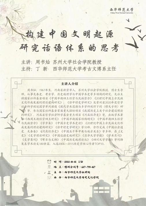 2022年11月12日,周书灿教授以《构建中国文明起源研究话语体系的思考》为题,为西华师范大学作了长达两个多小时的精彩报告。学术报告由西华师范大学社科处主办,西华师范大学历史文化天博体育 承办。报告由西华师范大学文播系主任丁新主持,西华师范大学历史文化天博体育 院长、党委书记朱华教授,高然教授,符永利副教授及张帅、钱学生等老师和上百名学生聆听了周教授的报告。报告结束后,丁新主任对周教授的讲座进行了精彩点评,周教授还即席回答了师生的提问。报告结束后,周教授还就国家社科基金项目申报应注意若干问题和西华师范大学中国古代史教研室教师进行了交流互动。朱华院长向周教授表示感谢,并盛情邀请周教授方便的时候到西华师范大学访问交流。