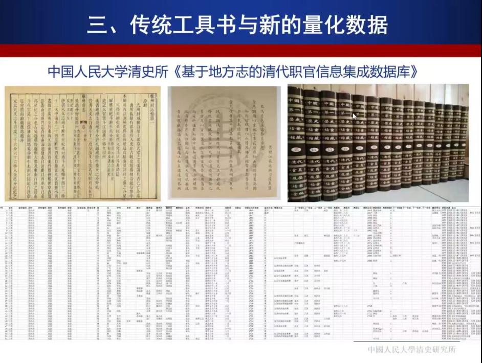 胡老师进一步提出开展“数字人文视野下的新政治史”探索,首要条件是要建立一套较为可靠的官僚政治史基础数据。随后胡老师主要介绍了两类数据系统:传统工具书和新的量化数据库。他认为,传统职官类工具书编纂不少,质量也较高,非常有助于据此建立底层数据系统,比较有代表性的如钱实甫先生的《清代职官年表》、李国祁等编纂的《清代基层地方官人事嬗递现象之量化分析》、魏秀梅先生编纂的《清季职官表》等。此外,清代官员量化数据库也日趋成熟,如香港科技大学李中清康文林团队主持的中国历史官员量化数据库(清代)、中国人民大学清史所正在建设的《基于地方志的清代职官信息集成数据库》等。胡老师进一步指出,随着数据库的逐渐成熟,未来容纳整个清代官员的全数据指日可待,在这一基础上,可以对清代的官僚政治史进行更多的探索,至少可以包括四个方面:1)对官僚结构的整体计量分析,探索官僚体系的动态变化,研究王朝兴衰的规律;2)官僚政治的空间分析;3)官僚系统流动性研究;4)政治网络分析。